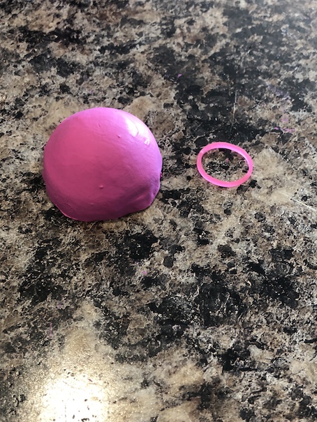 Since we were using what we had on hand, we had to paint our creme egg packaging. This took about five or six light coats of paint. Once dry, I hot glued a rainbow loom elastic at the center of the bottom for a base. This just helps the bowl to stay upright, and not wobble.