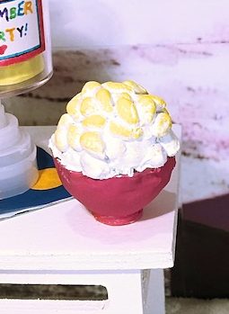Next, half fill your doll bowl with hot glue. Let dry. Then hot glue a pile of popcorn kernels on top. Once dry, paint the kernels with white paint. Lightly sponge some yellow paint on top for butter.