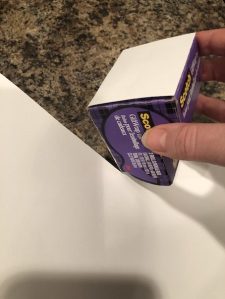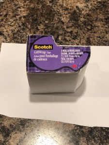 Okay, the first thing you want to do is cover your Scotch tape box with card stock paper. I use hot glue for this. Just bend and fold the paper around the shape of the box, gluing it in place as you go.
