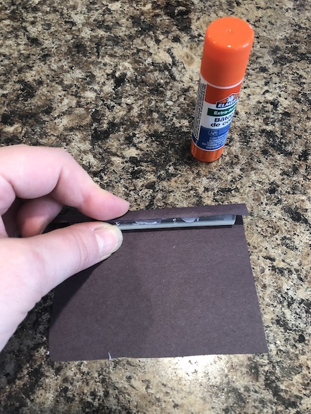 Once you have wrapped the card stock all the way around, it’s time to cover the sides. I just lay the box flat on the paper and trace each side. Cut it out and hot glue it in place.