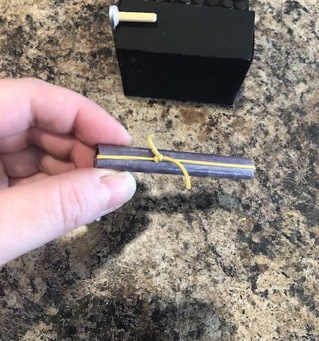 (We clearly did this wrong the first time around. We didn’t attach the elastic so we had to remove one of the popsicle stick arms to do so. Lesson learned, but good news for you! Attach the elastic on there first!)