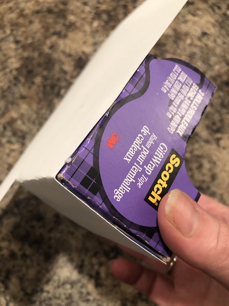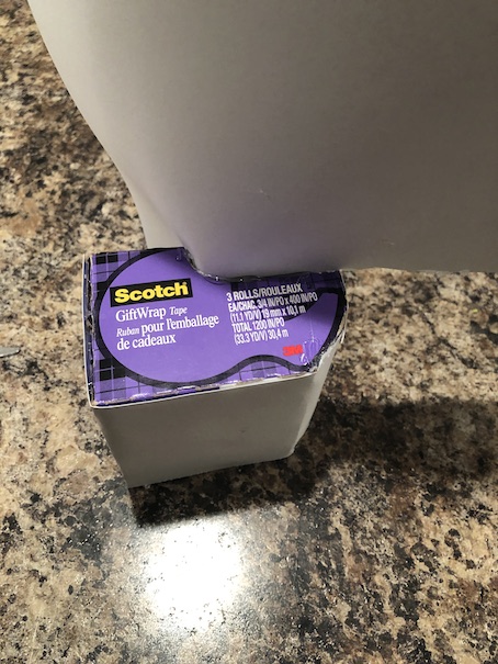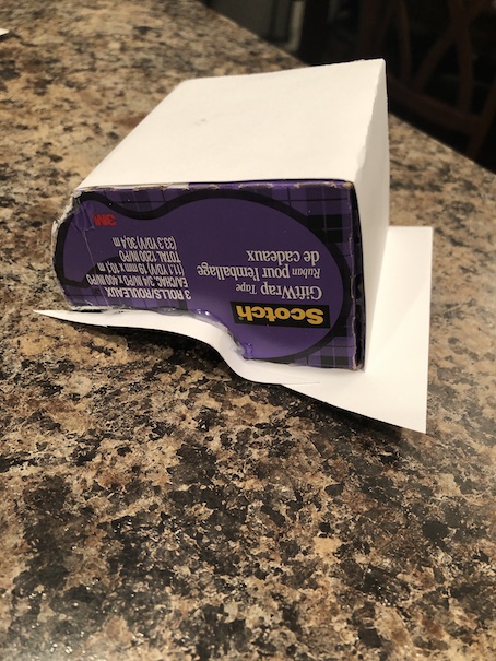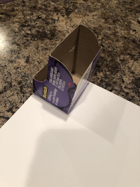 Okay, the first thing you want to do is cover your Scotch tape box with card stock paper. I use hot glue for this. Just bend and fold the paper around the shape of the box, gluing it in place as you go.