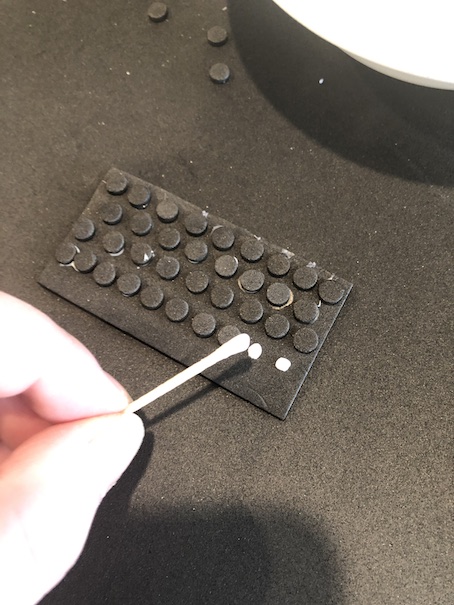 Using a toothpick and tacky glue, secure the dots to the keyboard panel. You should have 4 rows of nine or ten, and then a space at the bottom for the space bar, and a few other option keys.