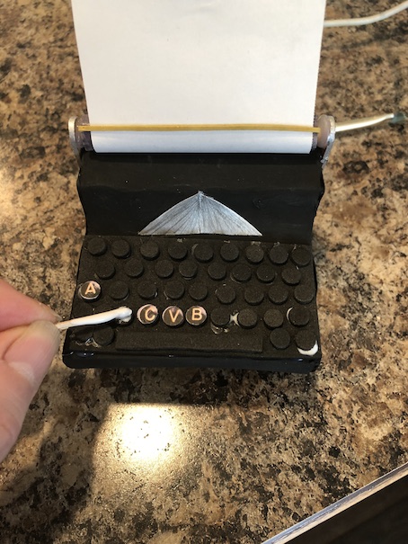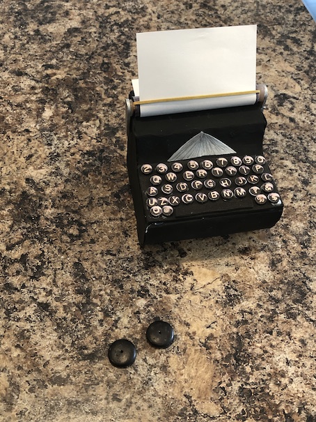 One last thing, and this is entirely optional. I had these small black flat beads. I hot glued them on the popsicle stick arms to look like little knobs. I just felt that it was one last detail that gave the typewriter more realism. You could also use black buttons.