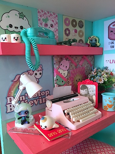 The only problem is that it’s pink. (the horror!) Now rather than force Kit to write her stories on a pink typewriter, I promptly handed it over to Maryellen instead. She has a love of everything pastel coloured, and she had the perfect little desk for it in her Loft Bed space.