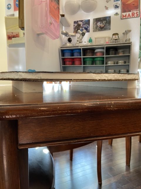 Finally, add some legs to your habitat. We had these blocks of styrofoam on hand, more packaging from my daughter’s desk. We just hot glued them onto the bottom. Hooray for reusing! If you don’t have any styrofoam, blocks of wood could work. We were contemplating using empty duct tape rolls for legs at one point too.