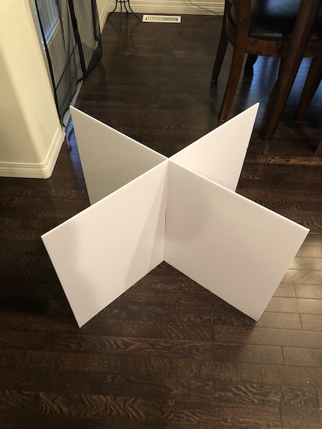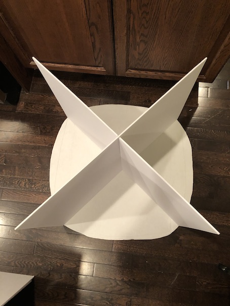 Take one piece of foam board (mine were 30X20 inches manufacturer’s measurements. I just used them as is from the dollar store), and find the center. Use an exacto knife to cut a slot about 2/3 up the middle. Do the same to the second sheet of foam board.You can now slide the two pieces of foam board together to form an X as shown. Be sure that the top of your X is flush. If it isn’t, you might need to adjust the slots that you cut in the board a little. Once you have the X as you like it, run a line of hot glue at the center to secure into place. We wrestled with the idea of making ours foldable for storage since large ticket doll items always take up a lot of space, but in the end we decided to make it a permanent set up. We do have a spot in the doll room down in the basement where we can store it. Also, we really wanted a base for our habitat.  To add the base, you are going to want two huge cardboard circles both with a diameter of one of your foam board sides. Ours as we mentioned was 30 inches in diameter. We always save any huge cardboard boxes that we get for doll projects. The circles don’t have to be perfect. We tried to rig up a large scale geometry compass using a pencil and a long piece of string, but our circles still turned out a bit wonky. Ah well.  Hot glue one of the circles to the bottom of your X. To reinforce the floor, trace the second circle onto a large board of styrofoam. We had some from the packing materials that came with my daughter’s new desk.