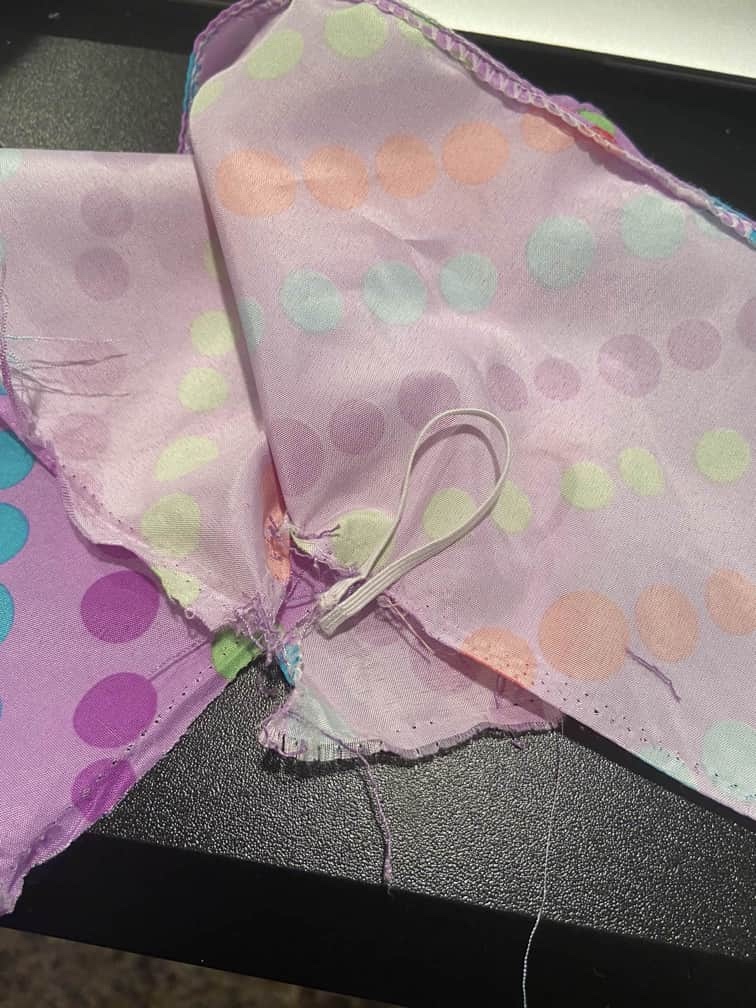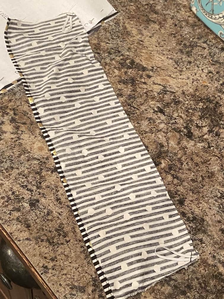 Pin your pattern pieces on your fabric. If your fabric has stripes like mine, be sure to cut your pieces all the same way, either horizontally or vertically. Cut out. Don’t lose the elastics.