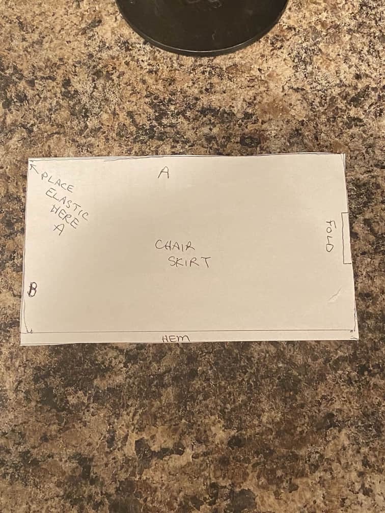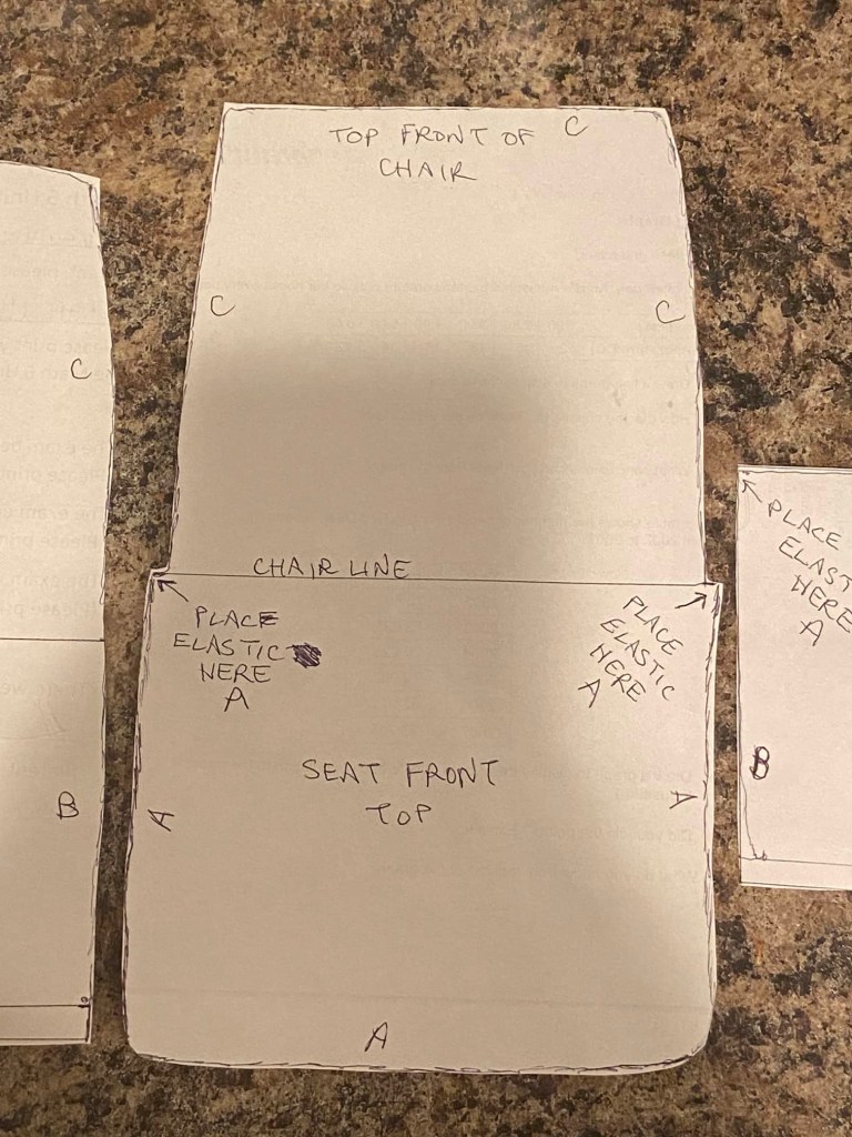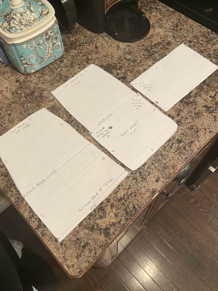 Now take all your pieces and trace them onto paper. You can use a ruler for this. I just eyeballed it. Be sure to add 1/4” for a hem at the bottom of the chair back as well as on the bottom of the chair skirt. Cut them out and mark all the info.
