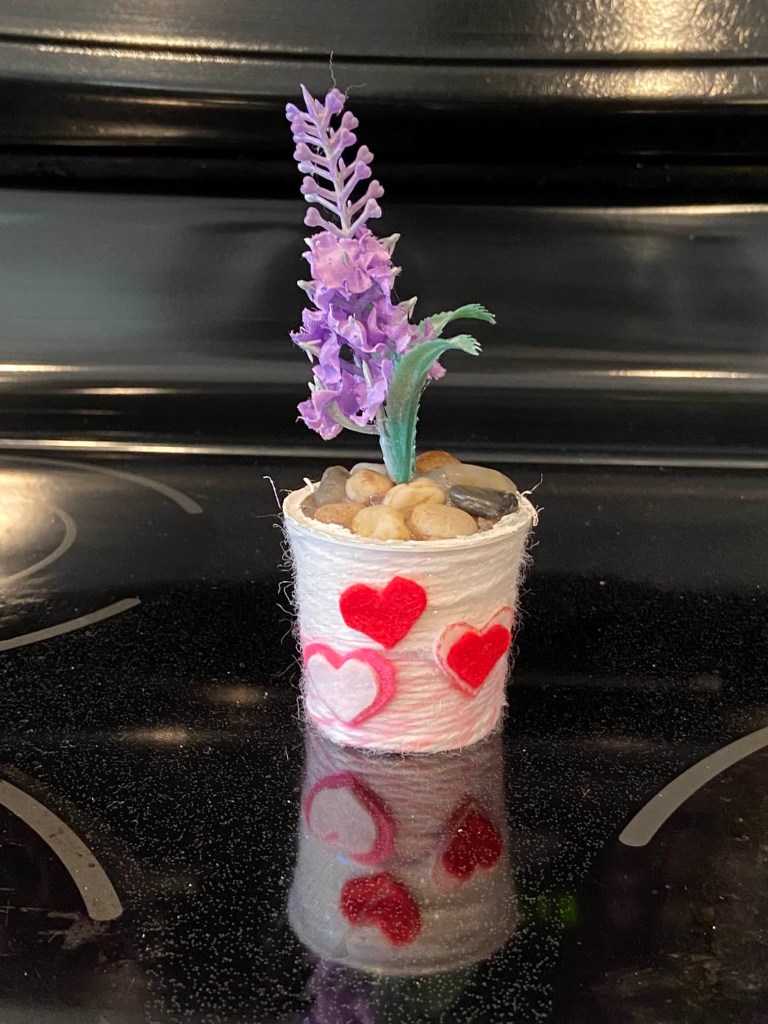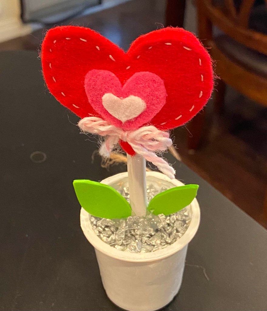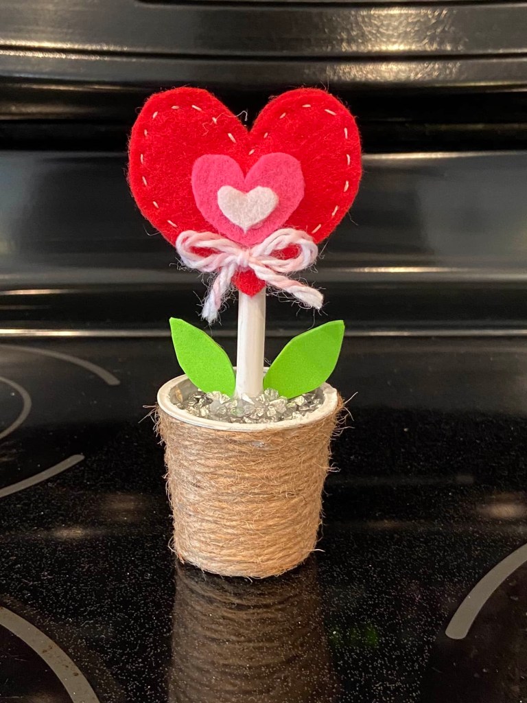 You could also hot glue a pom pom on top instead of the heart decoration. Tie a ribbon around it and you have a Valentine’s topiary. Add some hearts and embellishments for interest.