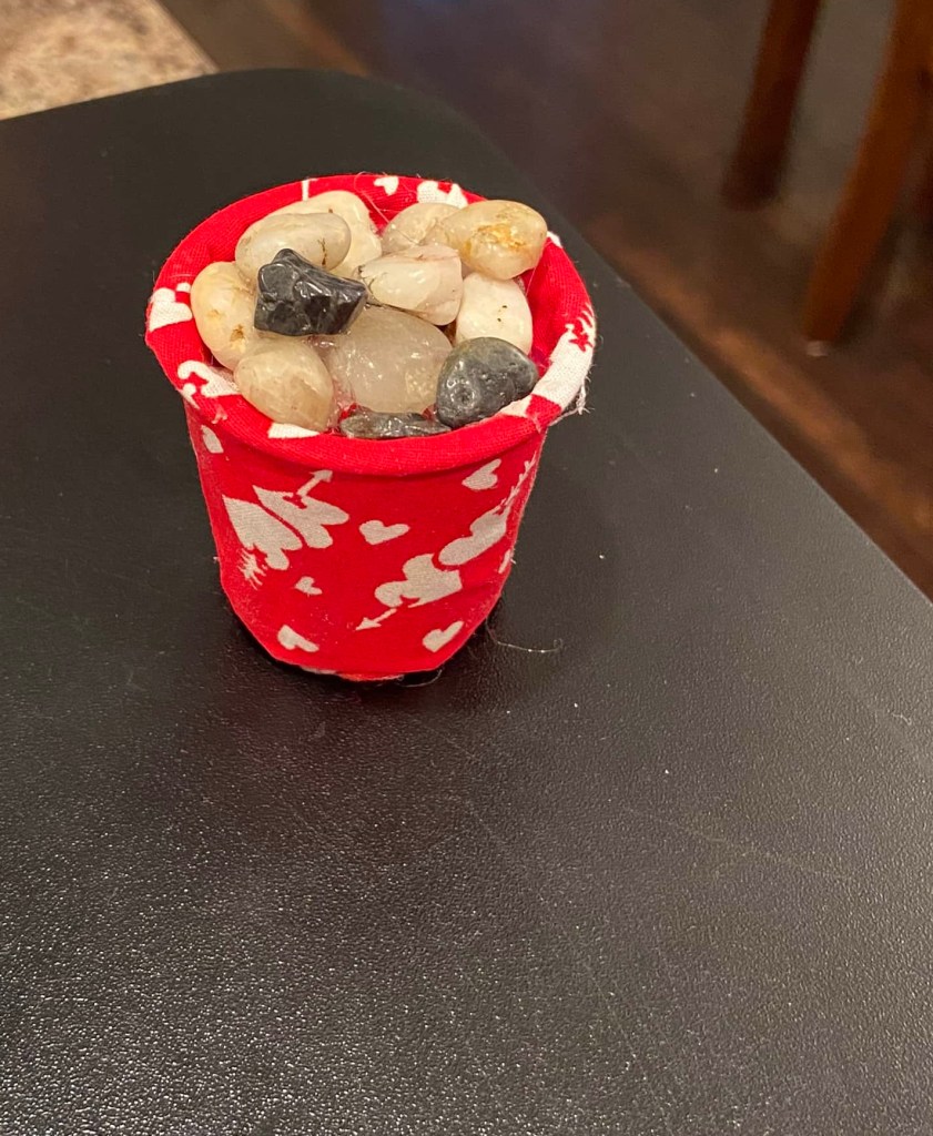 Next, fill the pot. If you are using a pencil/dowel, be sure to secure it with hot glue to the bottom of your pot before adding the rocks.
