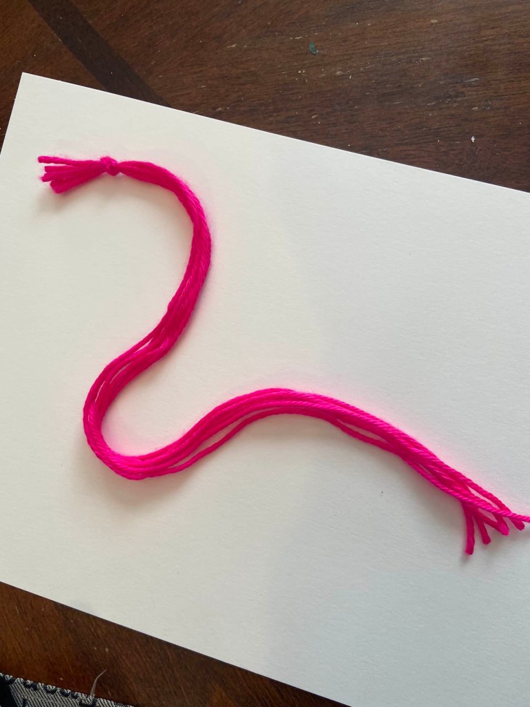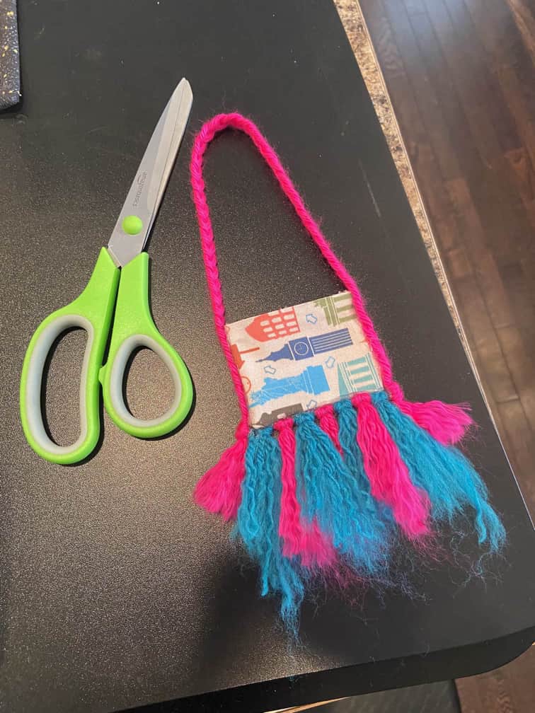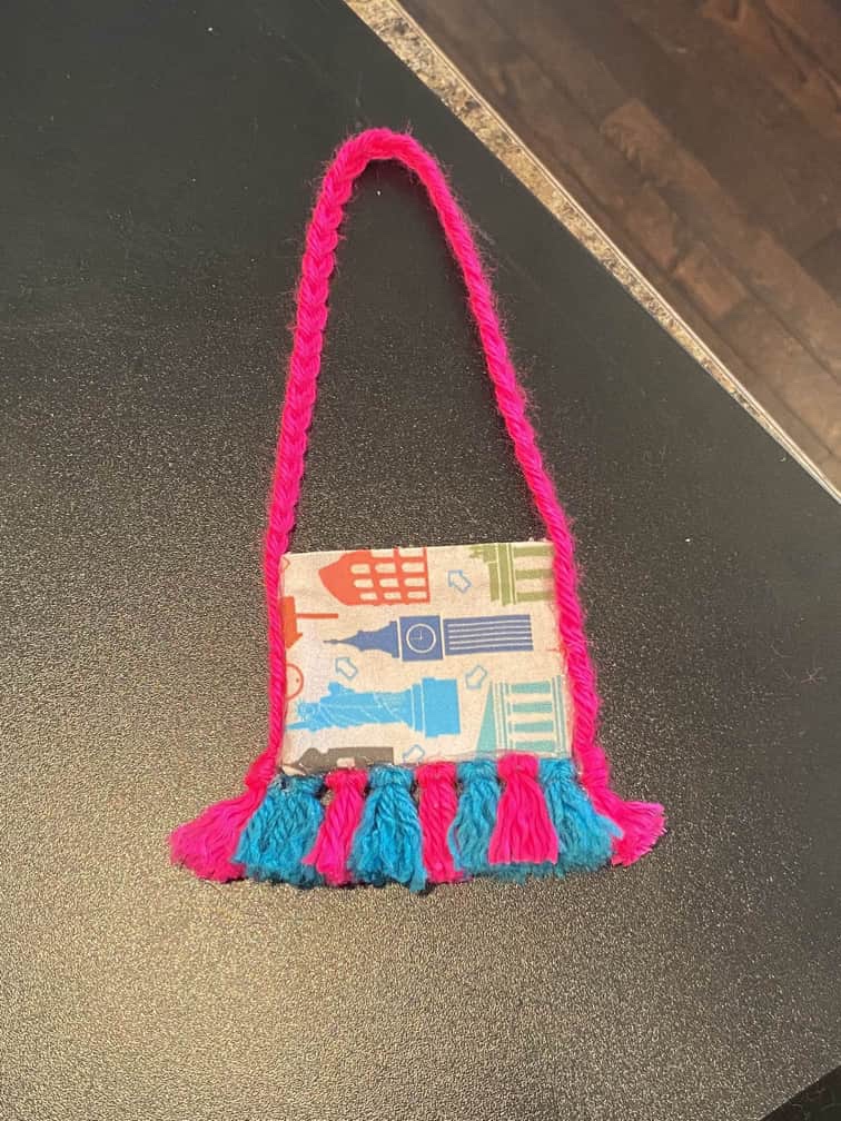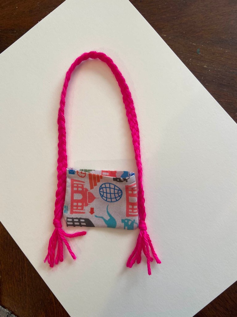 For our purse strap, we used 6 strands of pink yarn, each measuring 22 inches long. Tie a knot in the top of all the strands leaving a tassel.