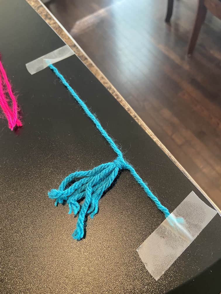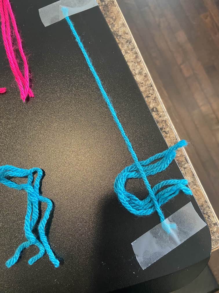 Fold one of the yarn bundles in half to make a loop. Pass the loop under the strand that is taped down.