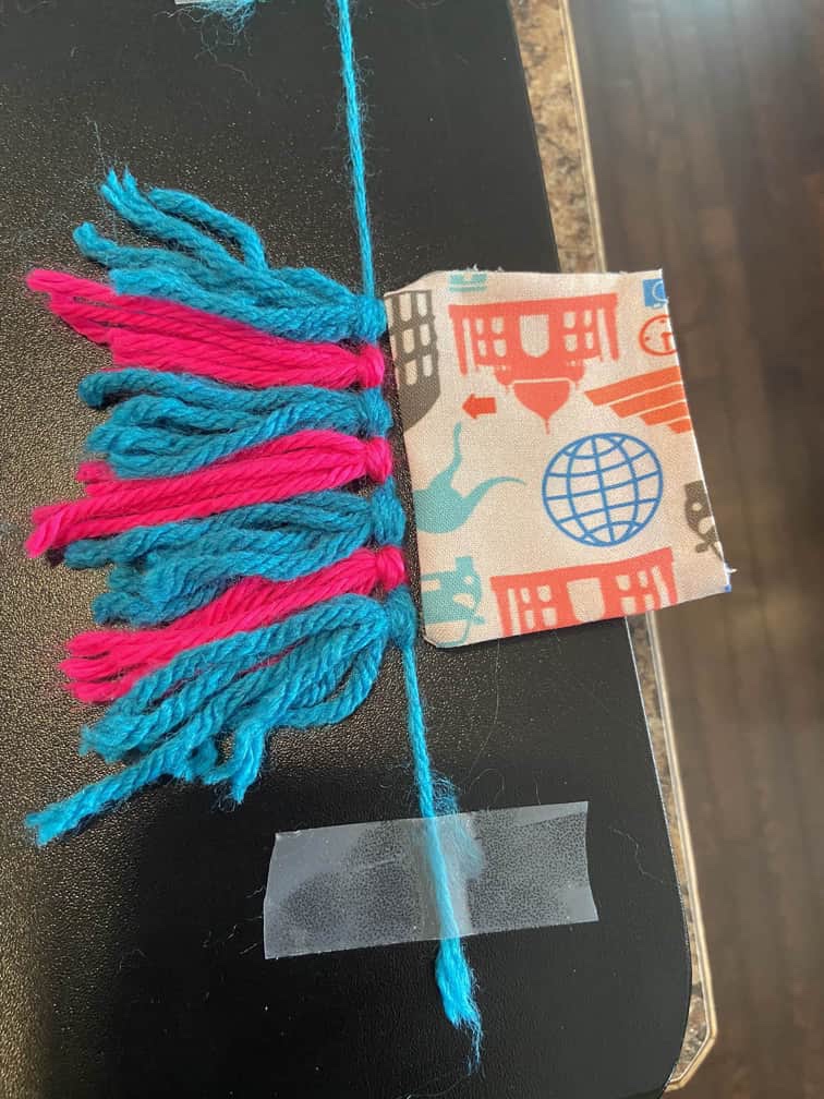 We made 8 tassels, keeping in mind that our purse strap is pink so the final tassel on either end is blue for contrast, and to continue the pattern.