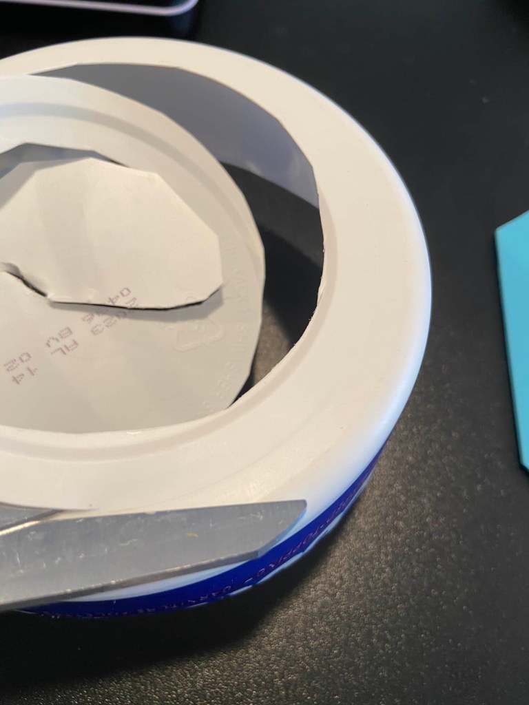 Next, we cut a hole in the bottom of the larger container.
