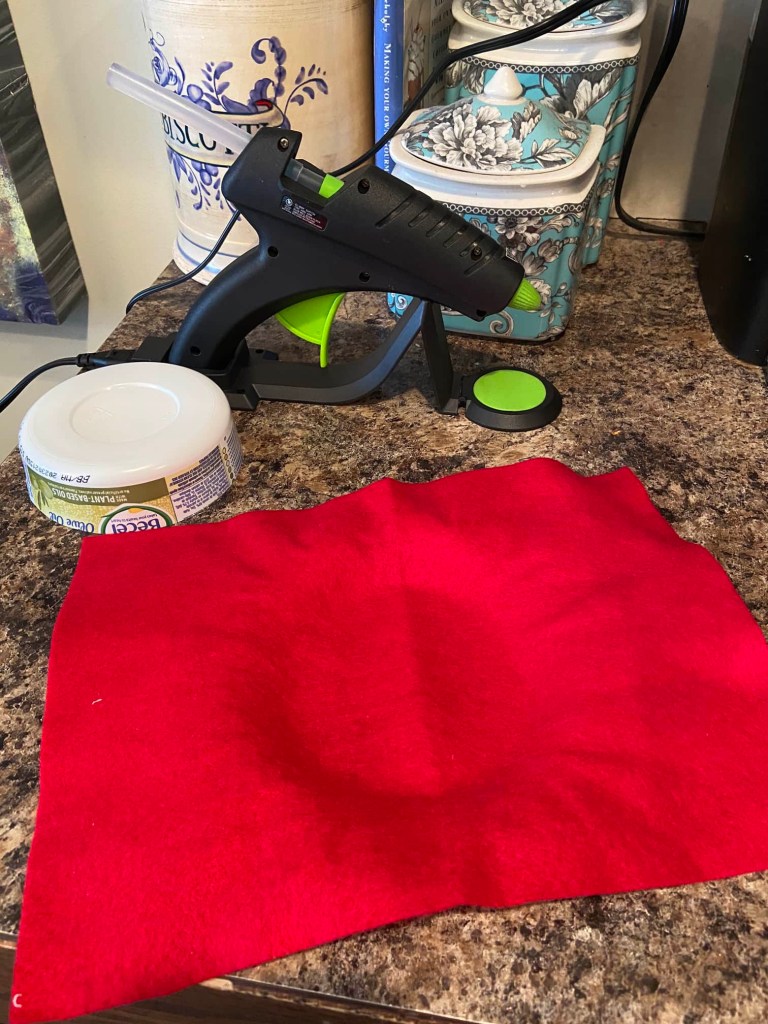 Hot glue the felt all the way around and up the sides of the container.
