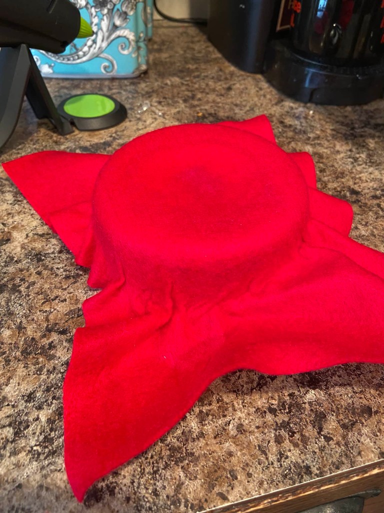 Finally, glue the top of the hat inside the hat brim. Simply run a line of hot glue along the edge and glue it in place.