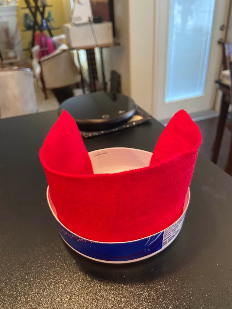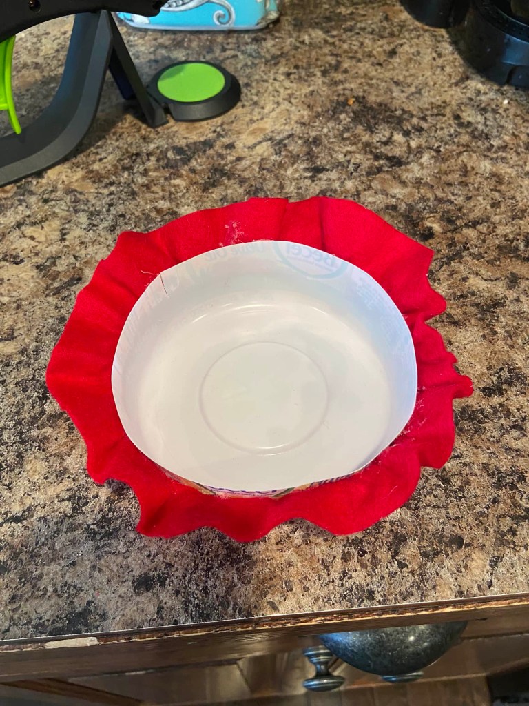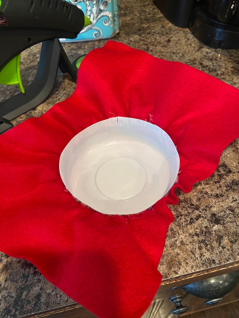 Hot glue the top of the container to the center of the creased felt.
