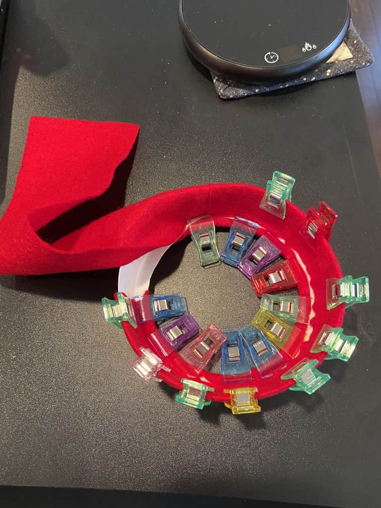 Next, we used the sewing clips once again to wrap the felt around the hat brim. So much easier! When you hot glue, remove the clips as you go.