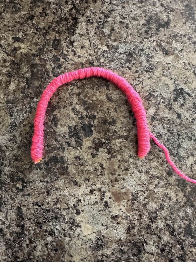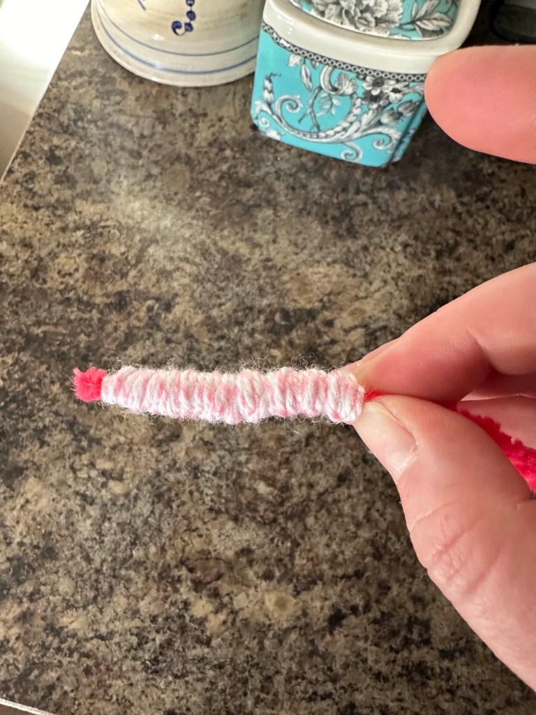 To keep it even, I kind of pinch the pipe cleaner with my fingers as I wrap, and I don’t move my finger until the yarn in that spot has been built up to match the previous wraps. However, if you find that parts of your wrapping are thinner than others, you can tie on more yarn and simply wrap more on there.