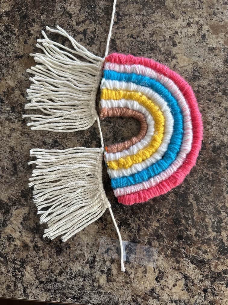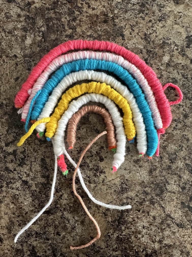 Tie many yarn loops on the string. Mine ended up needing 19 loops on each side of the rainbow, but you can just measure as you go.