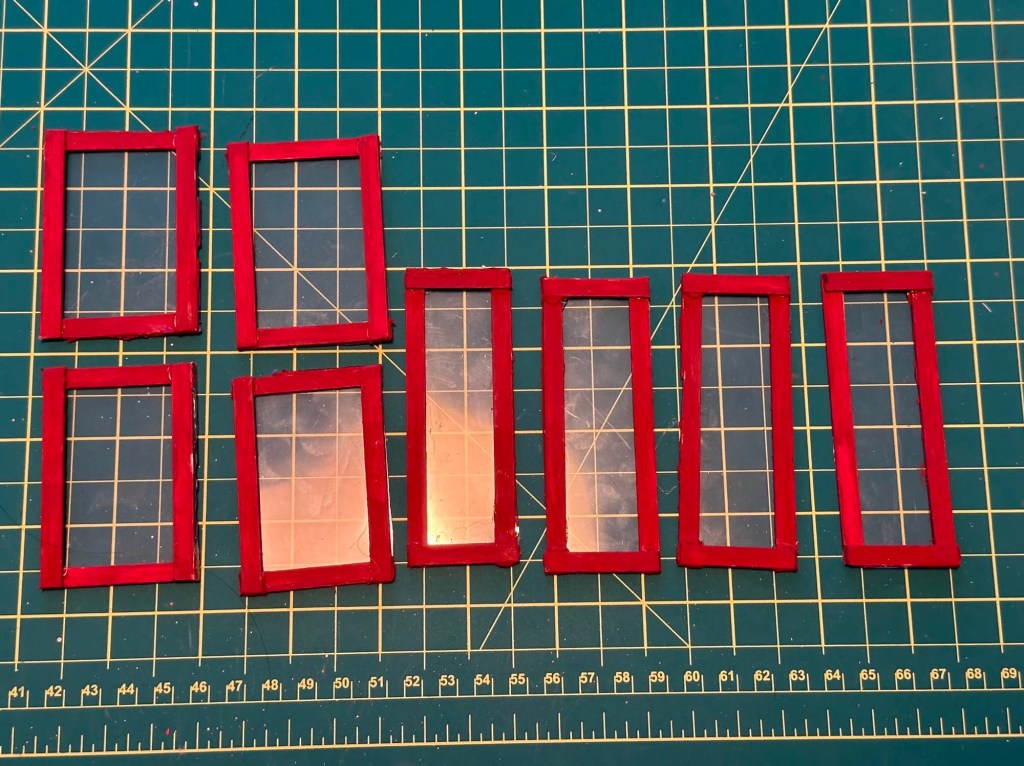 Next get out your plastic packaging. Measure and cut pieces to fit on the back of each box you assembled. Hot glue the plastic to the boxes to create little windows.