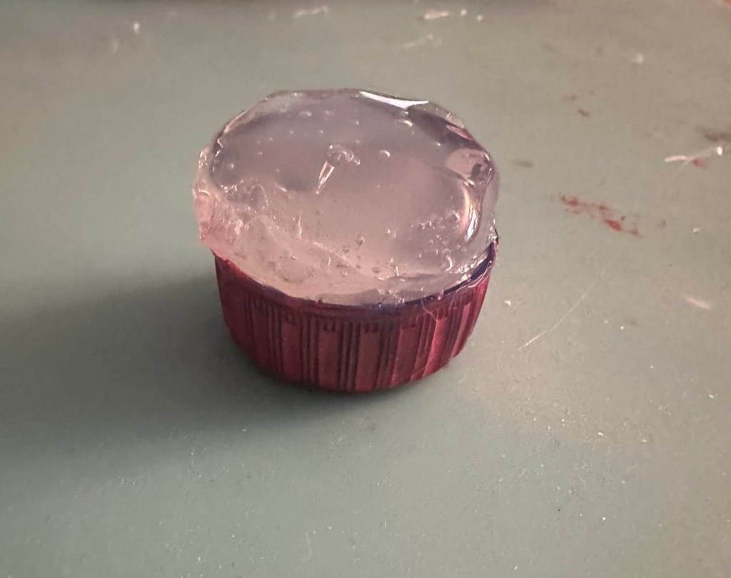 This also takes up more hot glue. It’s best to fill the bottle cap with some paper balls before adding the hot glue just to take up most of the space. When everything was done and cooled, I used the tip of the hot glue gun to create texture on the sundae.