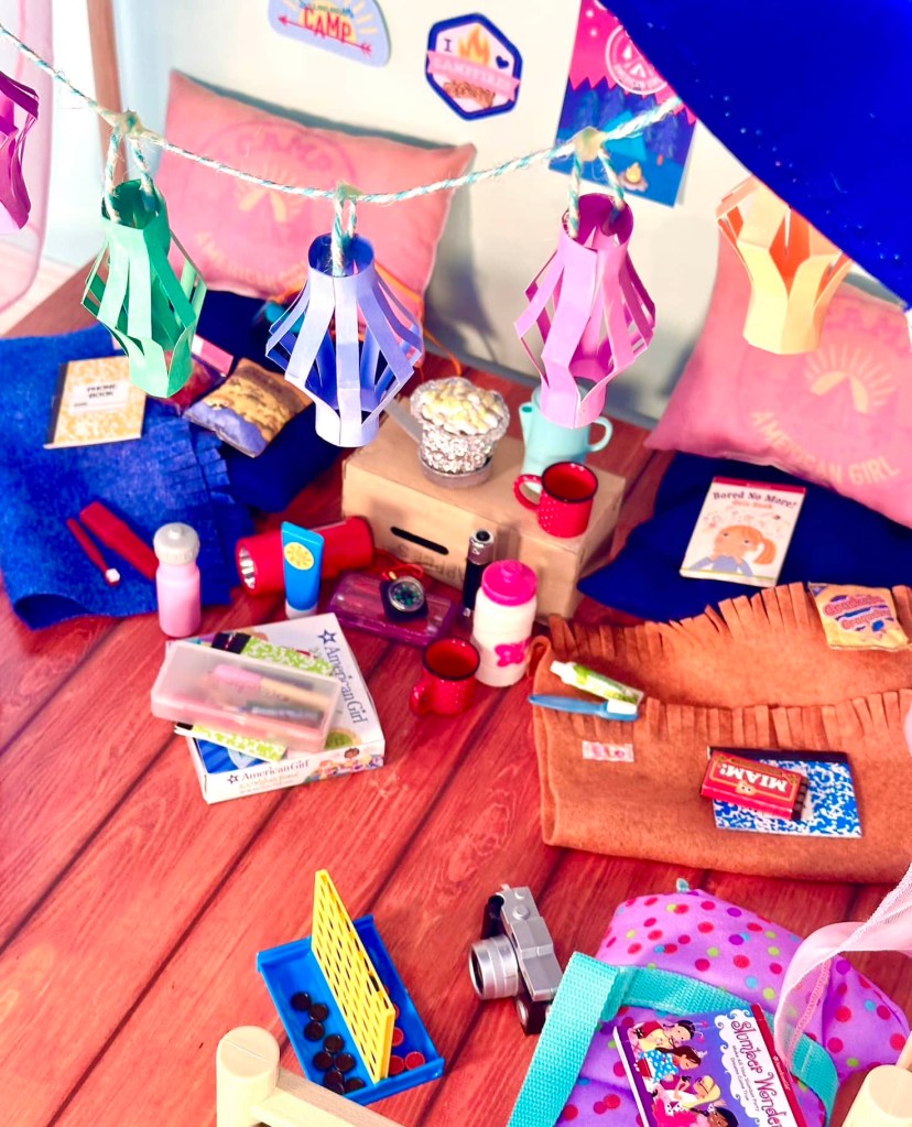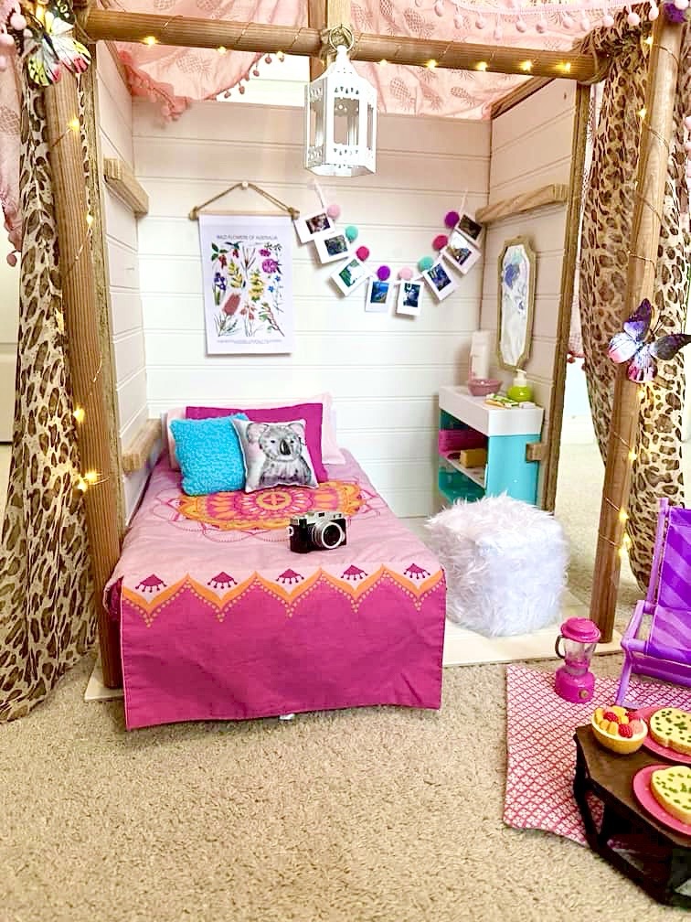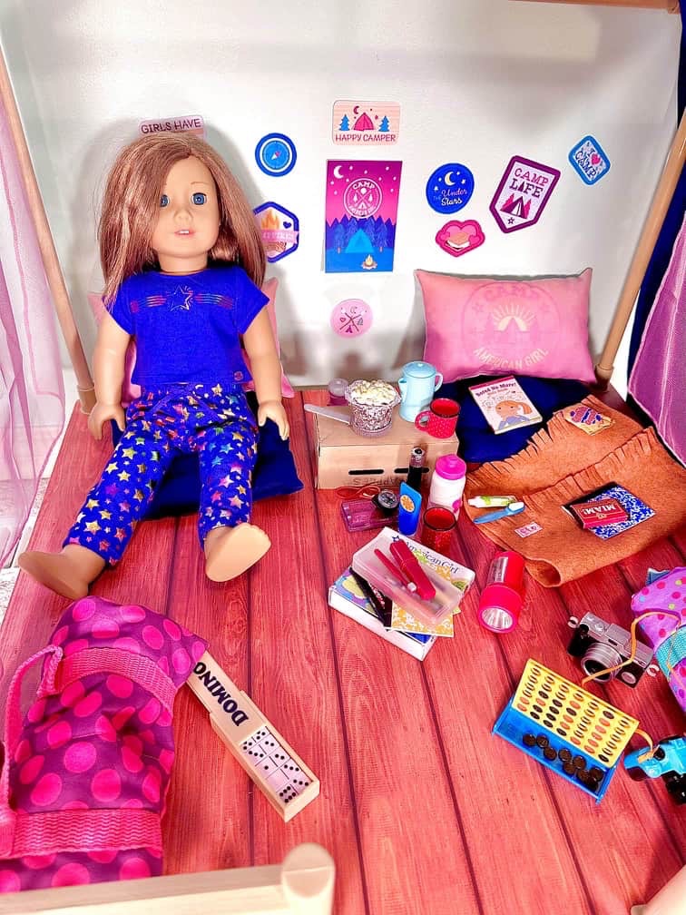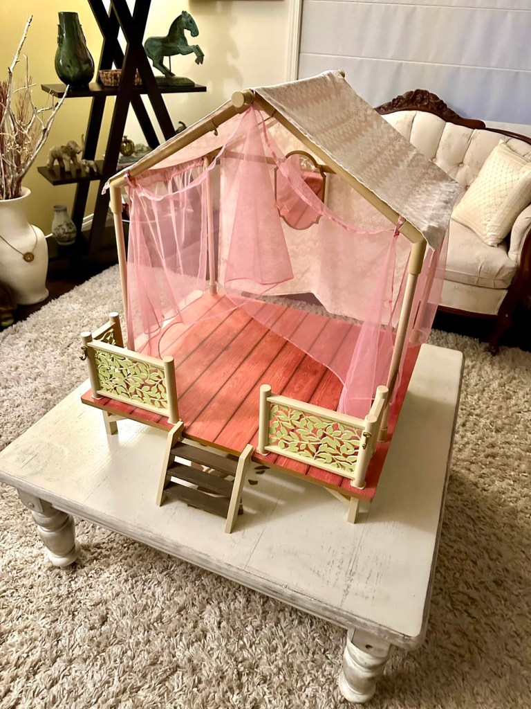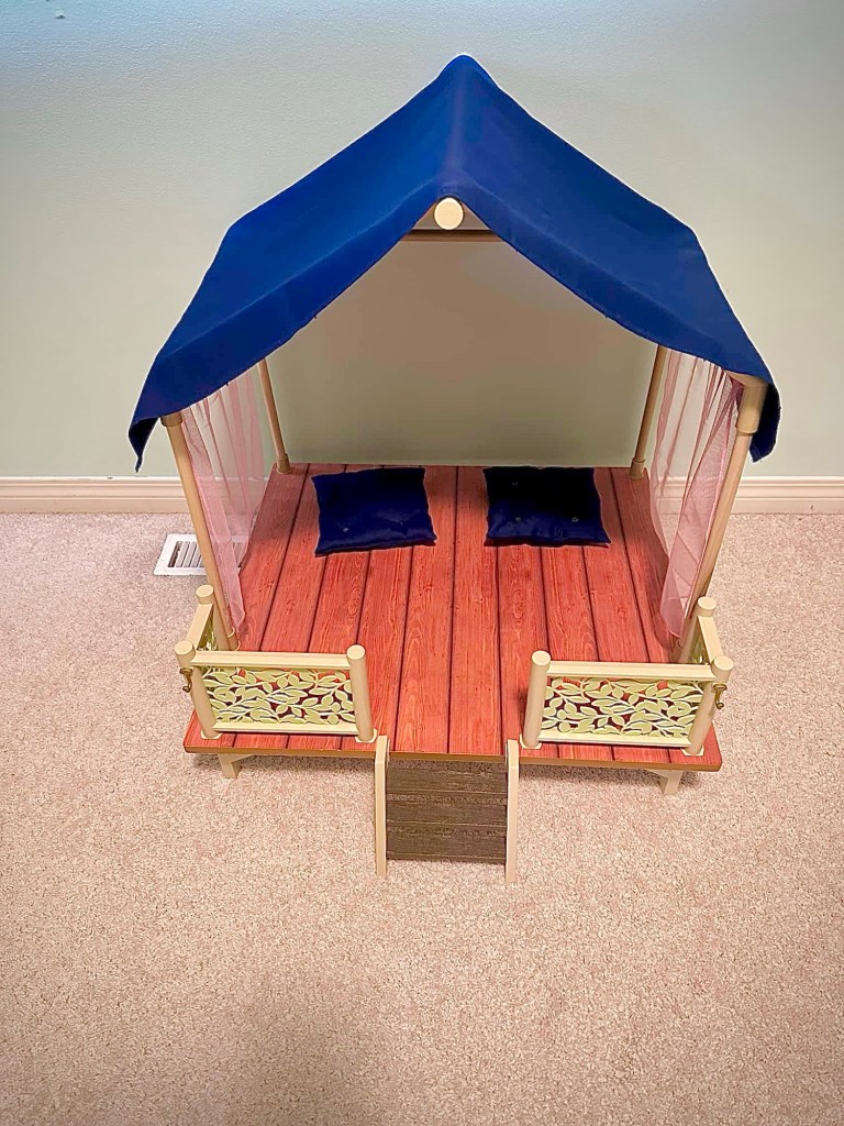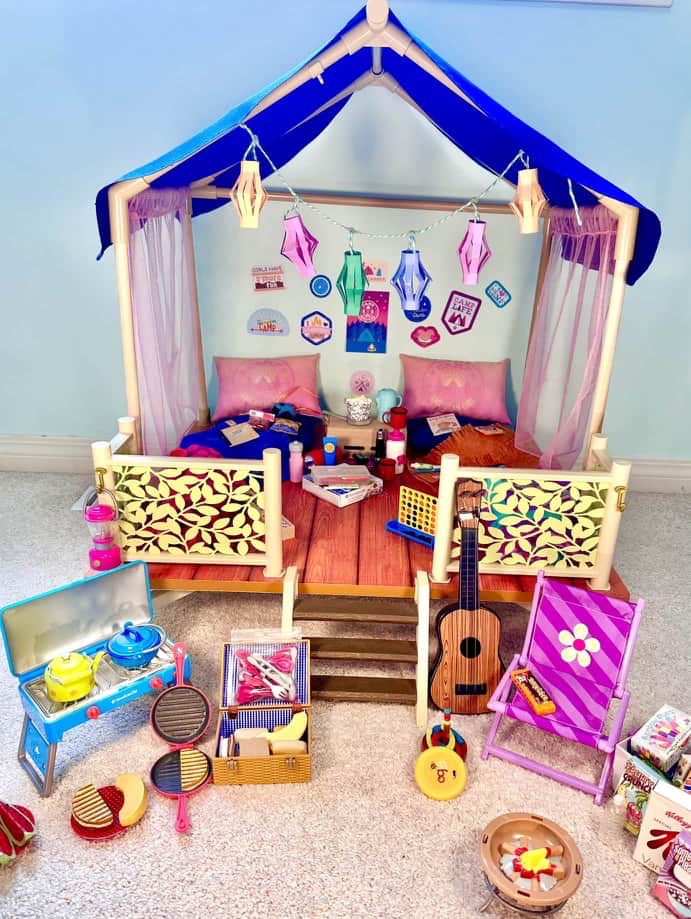 Hi guys! Time just flies lately! I am so excited for this DIY. When the AG Camp Hangout came out in 2019 my first thought was to try to recreate it using our DIY Lea’s Rainforest Hut. Then Kira’s Comfy Platform Tent came out in 2021 and I wanted that one more. So we took apart the rainforest hut and recreated it into Kira’s tent.