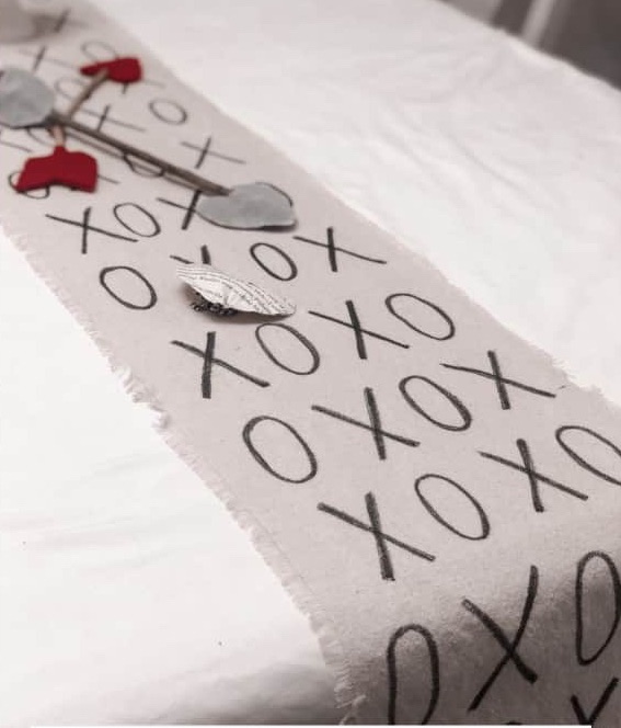 I frayed the edges of the runner by pulling some of the threads out. Then I used a permanent marker to draw on the X’s and the O’s.