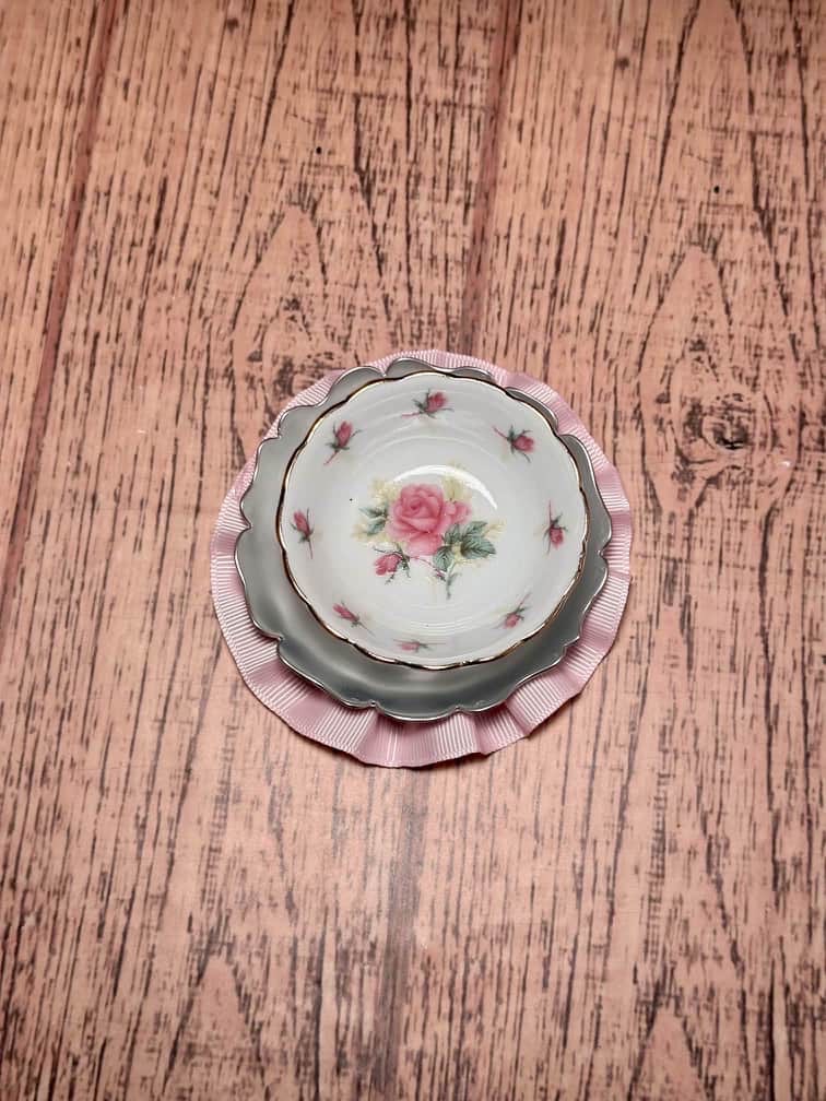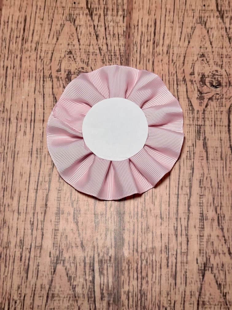 I cut and hot glued the ribbon to form round rosettes. They look like little tutus. 😂 My ribbon had a top edge band sewn on, so I clipped it off to help them lay flat.